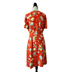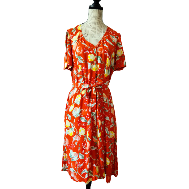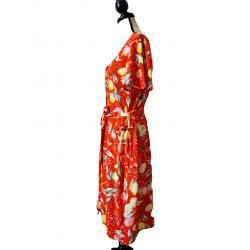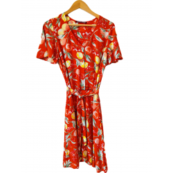Robe portefeuille mi-longue ceinturée, manches courtes, deux poches à côté, fleuri très joli.